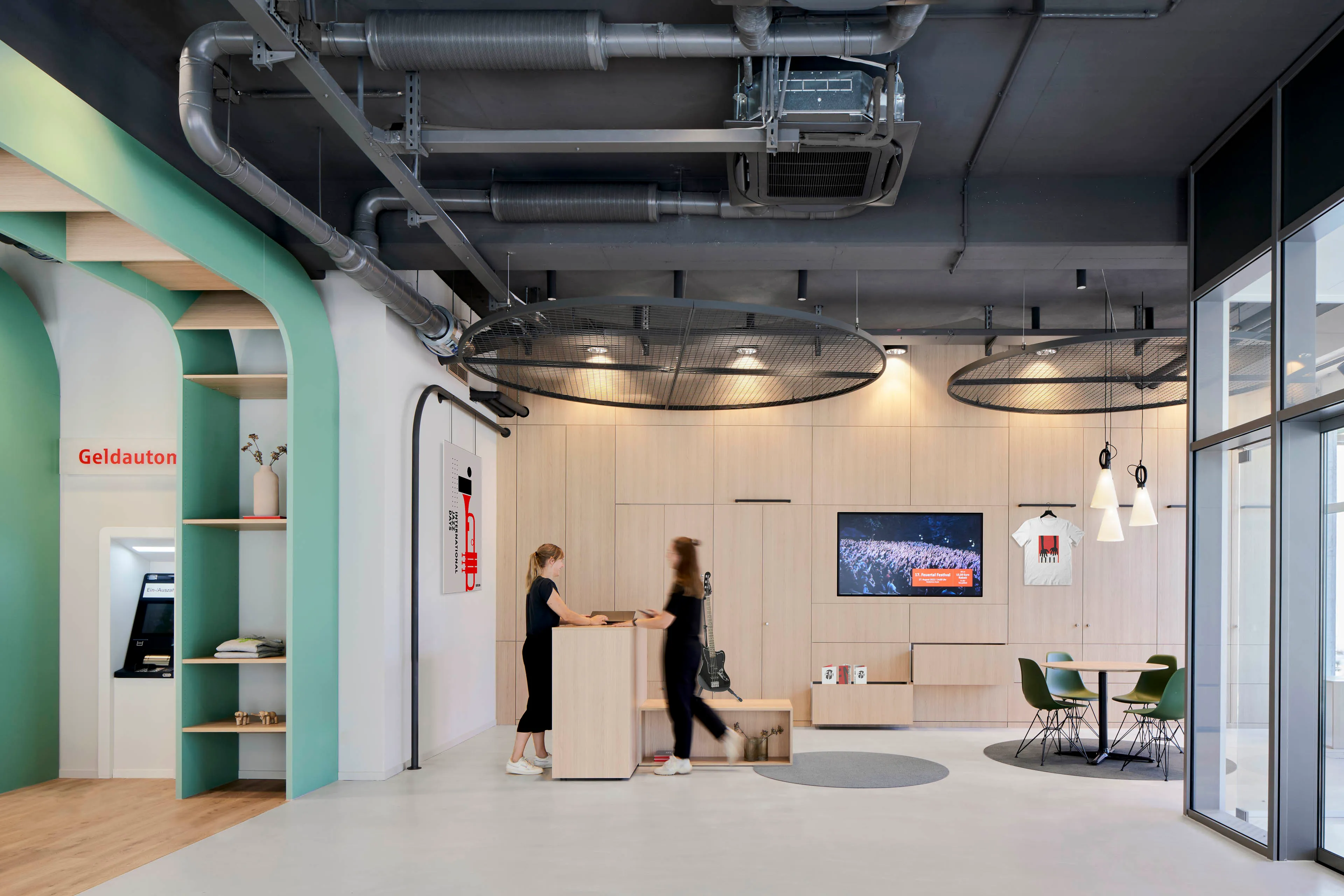 Im ersten Obergeschoss befindet sich ein multifunktionaler Veranstaltungsraum, der bestuhlt genügend Platz für 80 Gäste bietet. Er kann je nach Bedarf durch flexible Raumteiler in zwei unterschiedlich große Räume gegliedert werden, die dank separater Zugänge, eigener Garderoben sowie Veranstaltungstechnik parallel genutzt werden können. Der Zugang zum ersten OG ist wahlweise durch die Kundenhalle oder das Treppenhaus möglich.