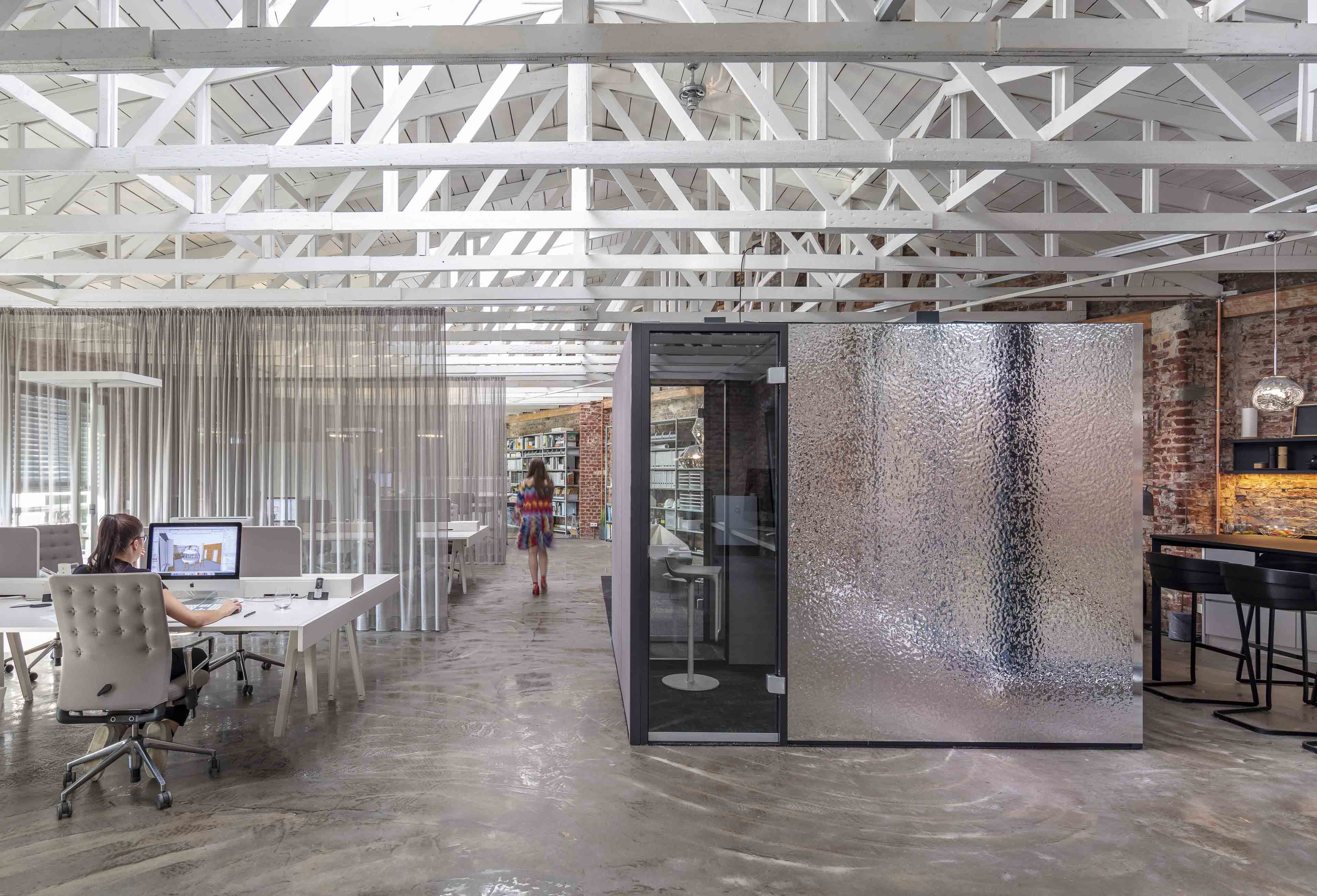 Halbtransparente Vorhänge mit metallischer Netzstruktur zonieren den Raum und bieten gleichzeitig Durchblick und Großzügigkeit. Die offene Arbeitslandschaft wird von einer Mikroarchitektur aus drei kombinierten Räumen unterbrochen, die den Raum zoniert und nach dem Prinzip Take Two jeweils zwei Nutzungen beinhaltet: So kann der Think Tank mit wenigen Handgriffen zum Relaxing Raum umfunktioniert werden. Diskokugel, Sternenhimmel und Liegefläche sorgen für die entsprechende Atmosphäre.