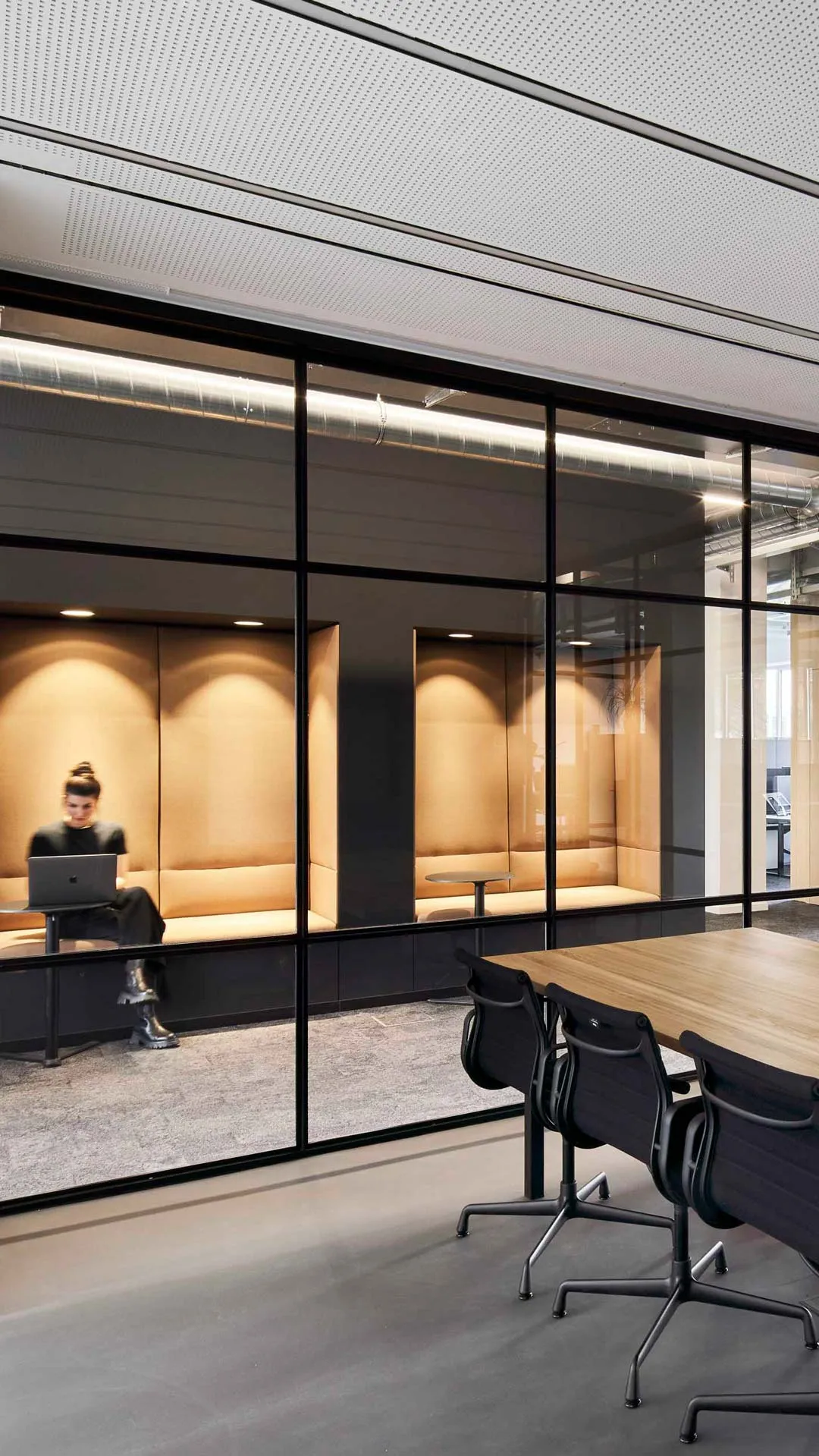 Für den effektiven Austausch mit den Kollegen und Kolleginnen im Homeoffice per Telefon oder Video-Konferenz gibt es kleine und große Rückzugsorte wie Einzelbüros oder Meetingräume. Die Zellenstruktur macht räumliche Einheiten im offen Multispace möglich, Desksharing kann jederzeit implementiert werden.