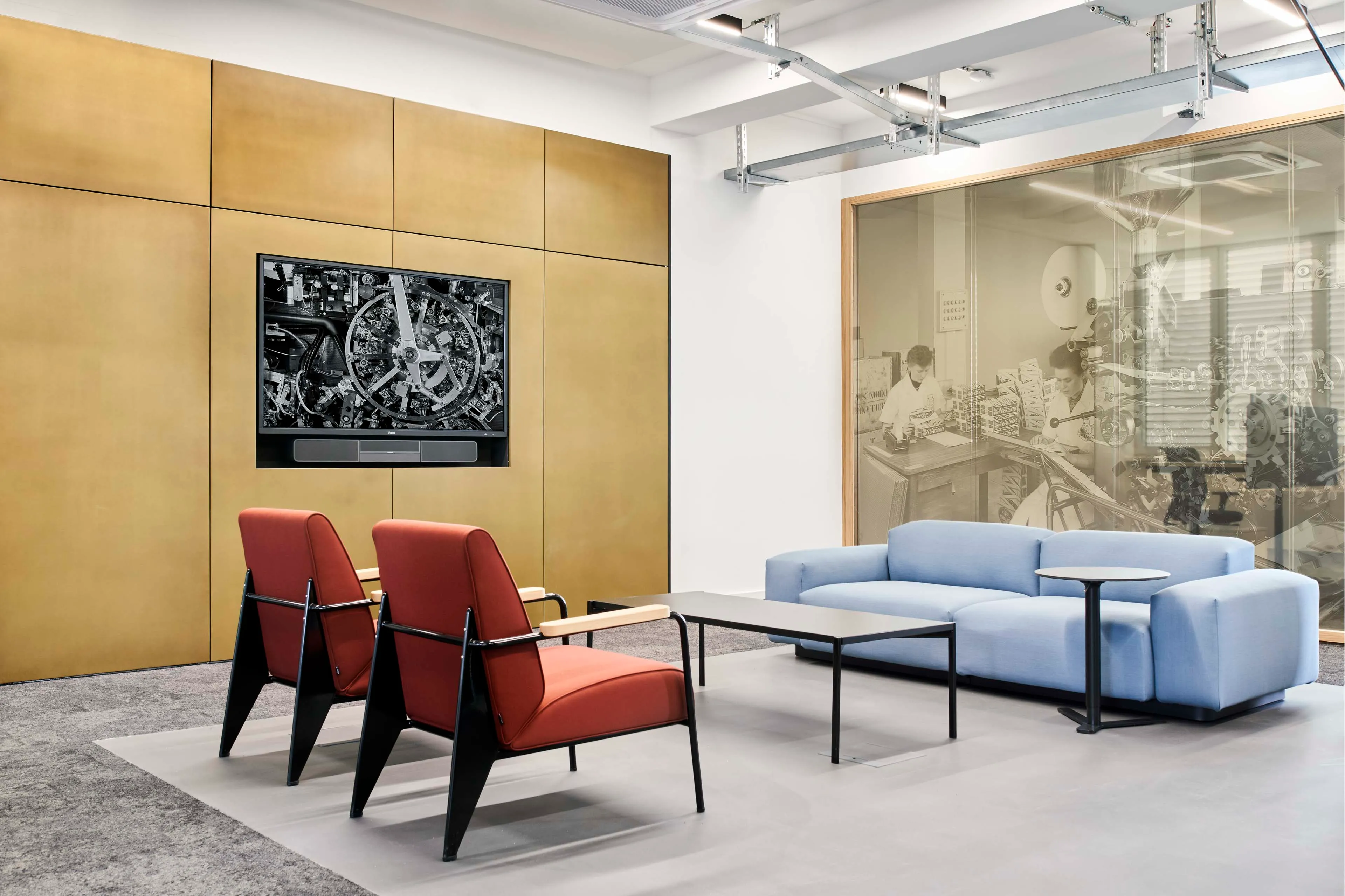 Wandzitate der Teekanne-Gründer, ein Tisch in Form der Zahl 1882, dem Jahr der Unternehmensgründung, Trennwände mit industriell anmutender Verglasung, die das Flair vergangener Tage versprühen: Die Historie der Teekanne ist überall präsent. Im Erdgeschoss, genau dort, wo früher der Tee verpackt wurde, erzählen großformatige Bildmotive auf Glas die Geschichte des Familienunternehmens. An anderer Stelle werden sich im Tea Point die Geschichten von heute erzählt, denn er ist einer der Orte, an dem die Mitarbeitenden zum spontanen Austausch zusammenkommen. Auch hier wird die Firmentradition anhand verschiedener Elemente erlebbar: Die Messingverkleidung erinnert an jene historischen Teedosen, die in gestapelter Form als Wandgrafik den Tea-Point prägen. Das Highlight des Raums bildet eine historische Original-Teekanne-Leuchte.